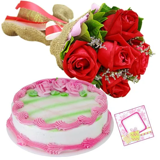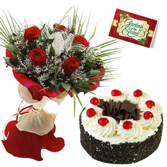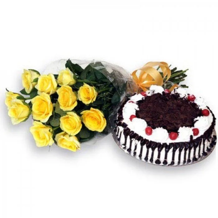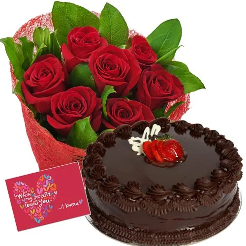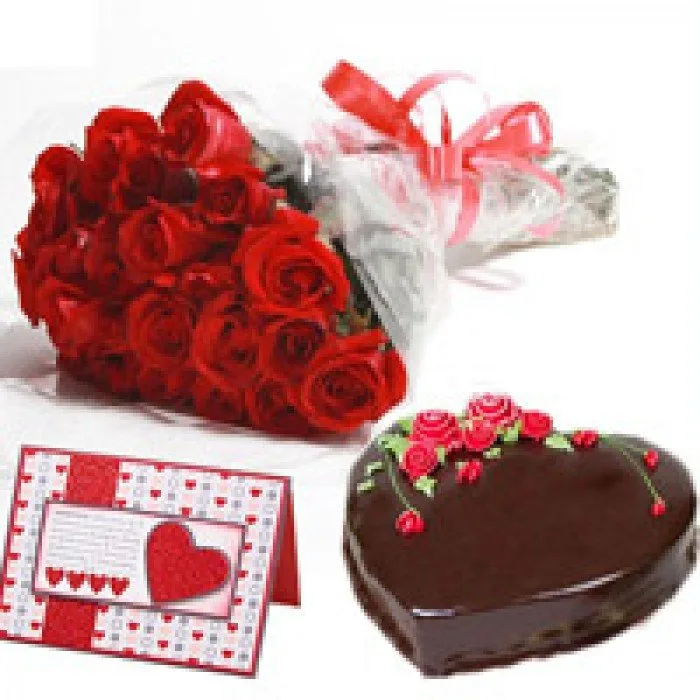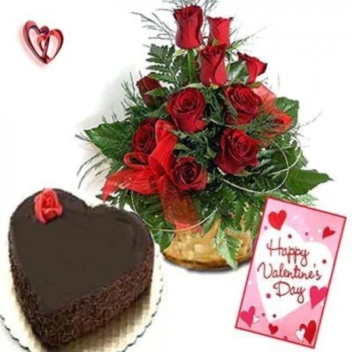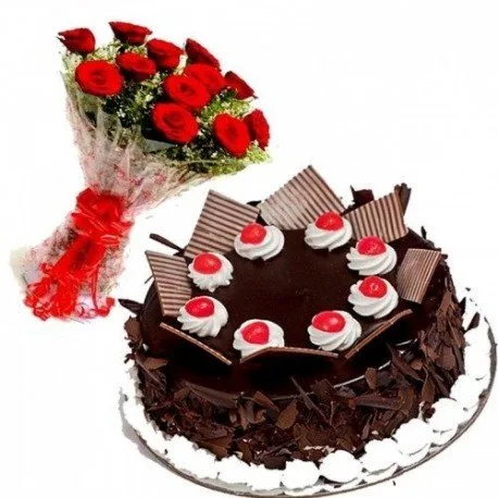 Heart Shape Black Forest Cake 10 Red Roses Bouquet And Love Card
