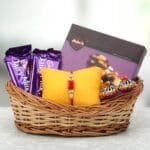 looking hamper which has loads of chocolates and a sweet and simple red stone rakhi. The rakhi is well complemented with decorative roli chawal.Rakhi Gifts Delivery Shop
