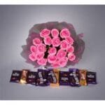Flowers Chocolates Online Dhanbad, A combo of a flower arrangement of 20 stems of pink Roses, wrapped in cellophane, and an assortment of 9 bars of chocolate worth 25 rs …